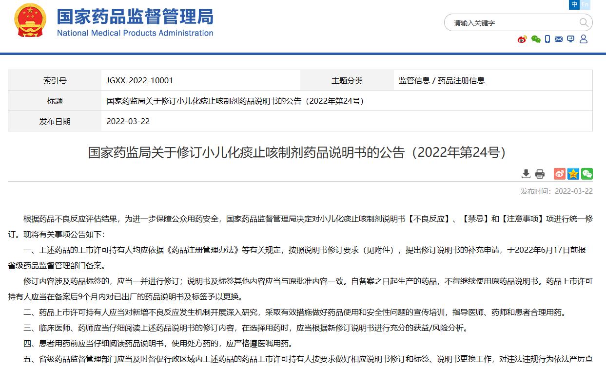 國(guó)家藥監(jiān)局關(guān)于修訂小兒化痰止咳制劑藥品說明書的公告(2022年第24號(hào))