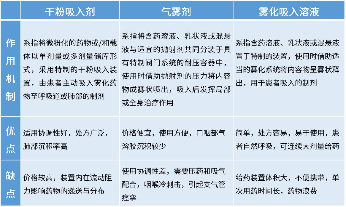 與傳統(tǒng)劑型不同,大多數(shù)經(jīng)口吸入制劑被設計為局部作用于肺部,主要有霧化吸入劑(nebulizer,也稱噴霧劑)、壓力定量吸入劑(pMDI,也稱氣霧劑) 和干粉吸入劑(DPI,也稱吸入粉霧劑) ,針對其作用機制及優(yōu)缺點見下表。