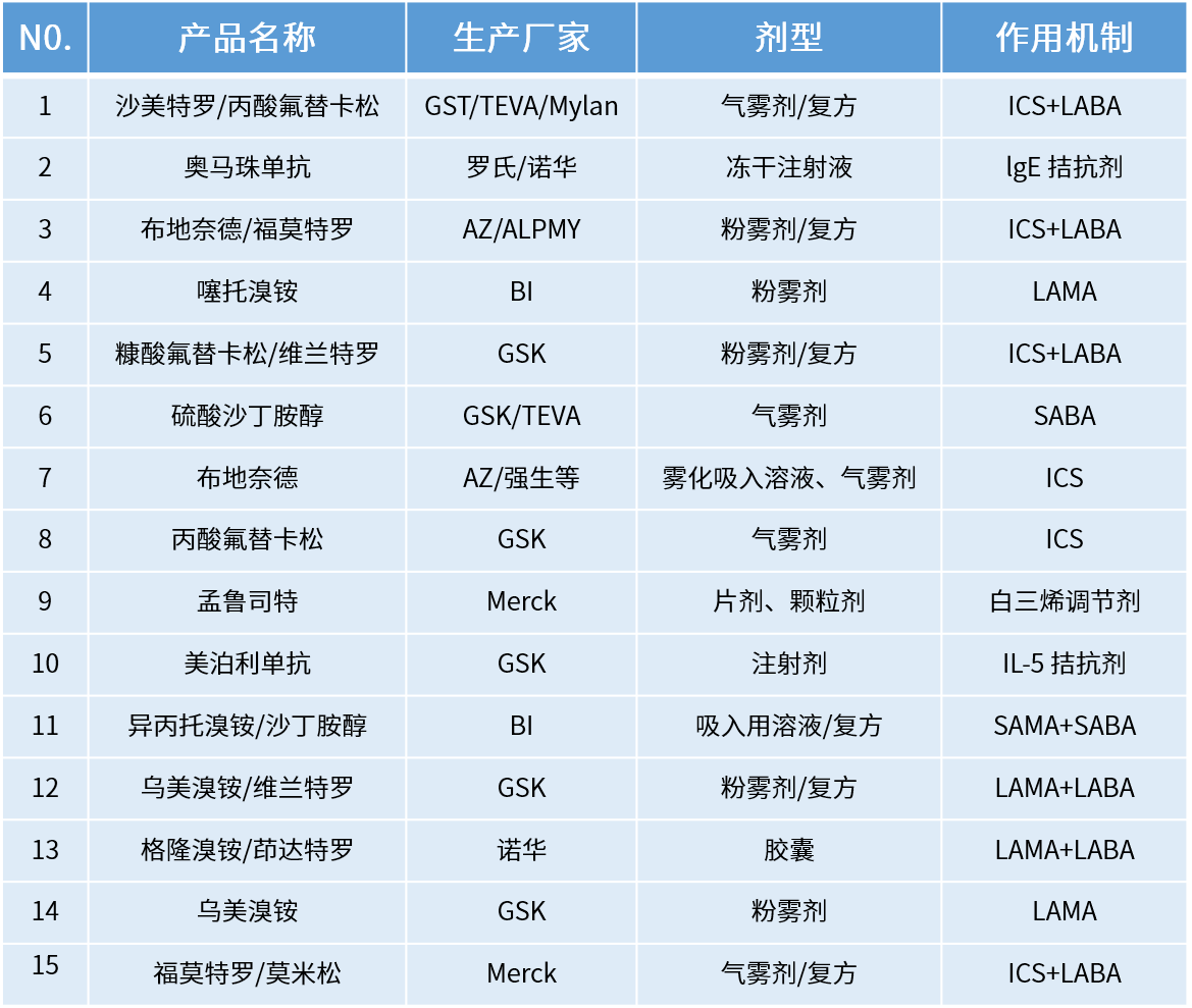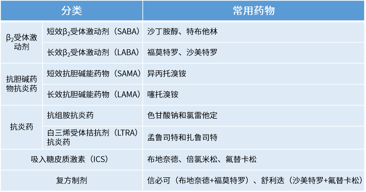 控制類藥物,即需要每天使用并長時間維持應用的藥物,包括吸入性糖皮質激素(ICS)、ICS/長效β2受體激動劑(ICS/LABA)、全身性激素、白三烯調節(jié)劑(LTRA)、緩釋茶堿、抗IgE單克隆抗體等;