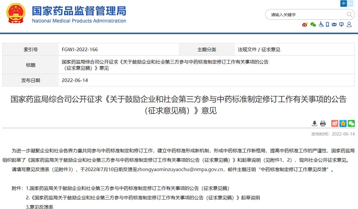 國家藥監(jiān)局綜合司公開征求《關(guān)于鼓勵企業(yè)和社會第三方參與中藥標(biāo)準(zhǔn)制定修訂工作有關(guān)事項的公告(征求意見稿)》意見