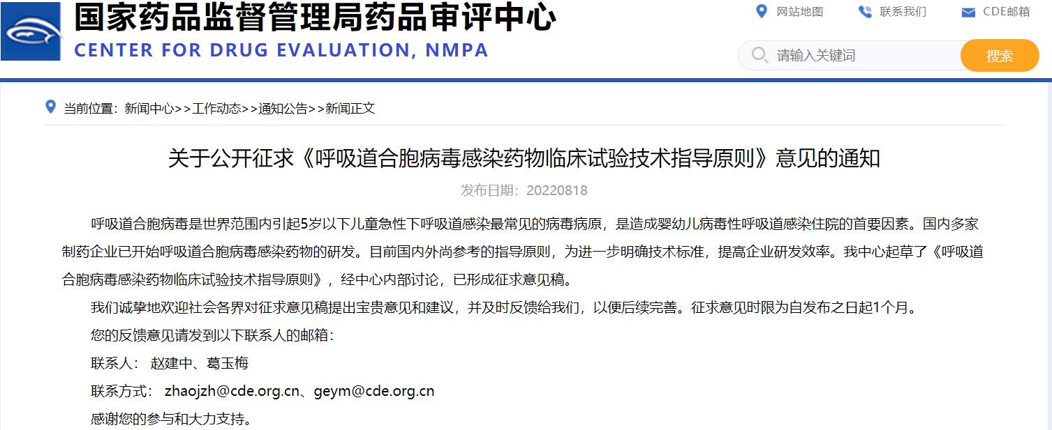 關(guān)于公開征求《呼吸道合胞病毒感染藥物臨床試驗(yàn)技術(shù)指導(dǎo)原則》意見的通知