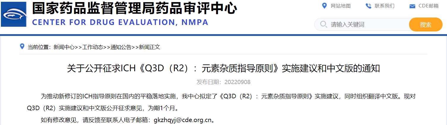 關(guān)于公開征求ICH《Q3D(R2):元素雜質(zhì)指導(dǎo)原則》實施建議和中文版的通知