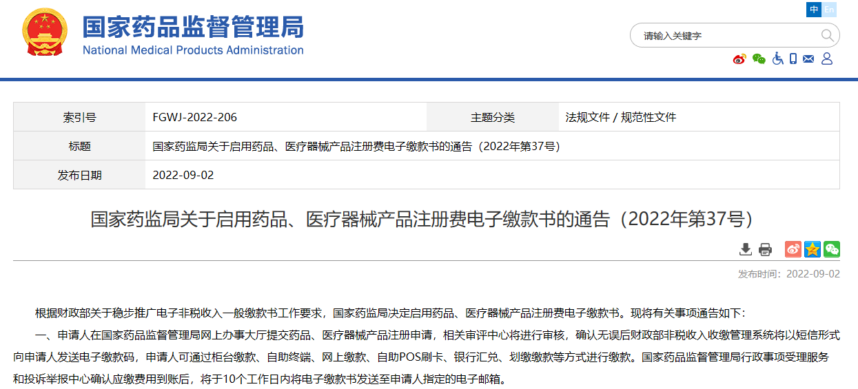 國家藥監(jiān)局關(guān)于啟用藥品、醫(yī)療器械產(chǎn)品注冊費電子繳款書的通告(2022年第37號)