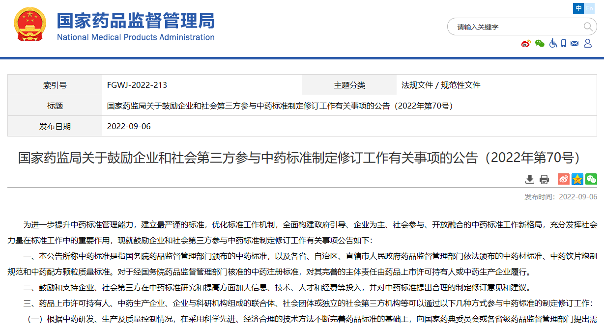 國家藥監(jiān)局關(guān)于鼓勵企業(yè)和社會第三方參與中藥標準制定修訂工作有關(guān)事項的公告(2022年第70號)