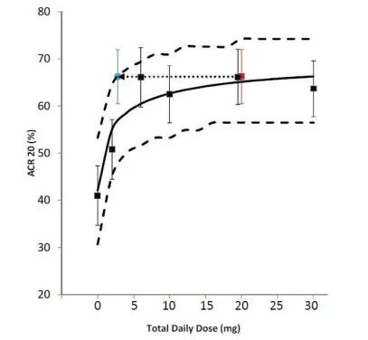 上述結(jié)果,美國風(fēng)濕協(xié)會認(rèn)為20mg(qd)和10mg(bid)的療效一致。而兩者的PK參數(shù)中Cmin值降低7倍(約為86%),該值遠(yuǎn)遠(yuǎn)大于緩釋制劑11mg(qd)和速釋制劑5mg(bid)的差異(降低約29%)。因此緩釋制劑和速釋制劑雖Cmin和Ctrough值有差異,但并不影響的藥效,兩種制劑的藥效一致。