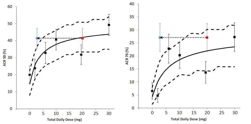 本品種PD研究中以美國風(fēng)濕病學(xué)會(ACR)規(guī)定觀指標(biāo),若患者達(dá)到20%、50%或70%的緩解,即達(dá)到ACR20、ACR50或ACR70緩解。