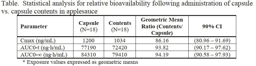 數(shù)據(jù)表明兩種服藥方式生物等效,表明該膠囊服用時(shí)可去掉囊殼,膠囊內(nèi)容物與軟性食物一同服用。
