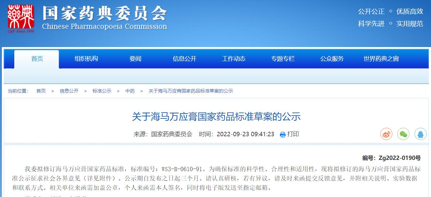 1. 本周發(fā)布海馬萬(wàn)應(yīng)膏國(guó)家藥品標(biāo)準(zhǔn)草案的公示。