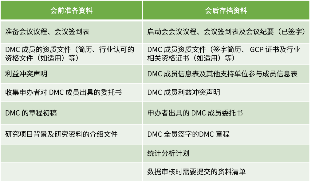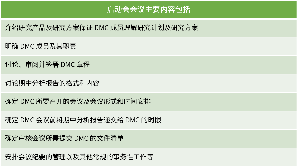 DMC啟動會應在首例受試者入組前召開,參會人員包含但不限于所有DMC成員、項目研究團隊和獨立統(tǒng)計團隊。