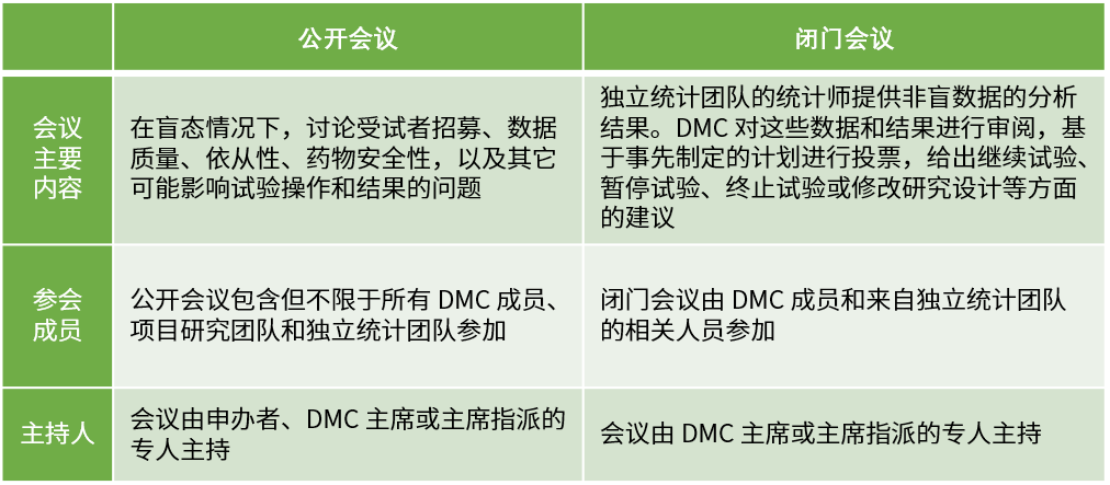 計劃會議需要按照根據(jù)DMC章程規(guī)定的頻率、形式開展,通常根據(jù) DMC目的以及試驗預期入組率、事件發(fā)生率、隨訪期等執(zhí)行情況而定。DMC會議分為公開會議和閉門會議兩種形式。