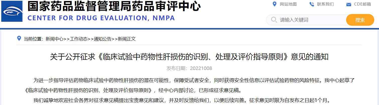關(guān)于公開征求《臨床試驗(yàn)中藥物性肝損傷的識別、處理及評價指導(dǎo)原則》意見的通知