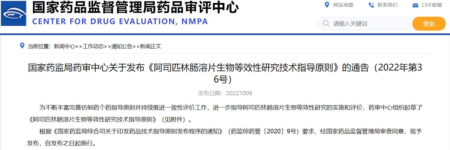 國家藥監(jiān)局藥審中心關(guān)于發(fā)布《阿司匹林腸溶片生物等效性研究技術(shù)指導(dǎo)原則》的通告(2022年第36號)
