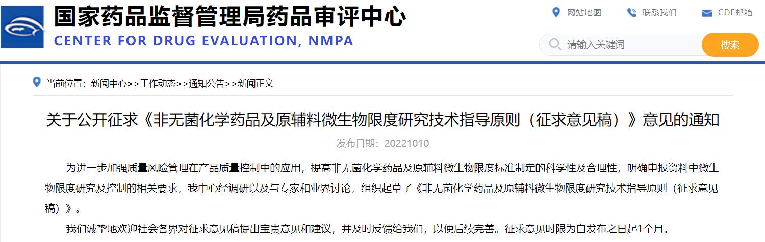 關(guān)于公開征求《非無菌化學(xué)藥品及原輔料微生物限度研究技術(shù)指導(dǎo)原則(征求意見稿)》意見的通知