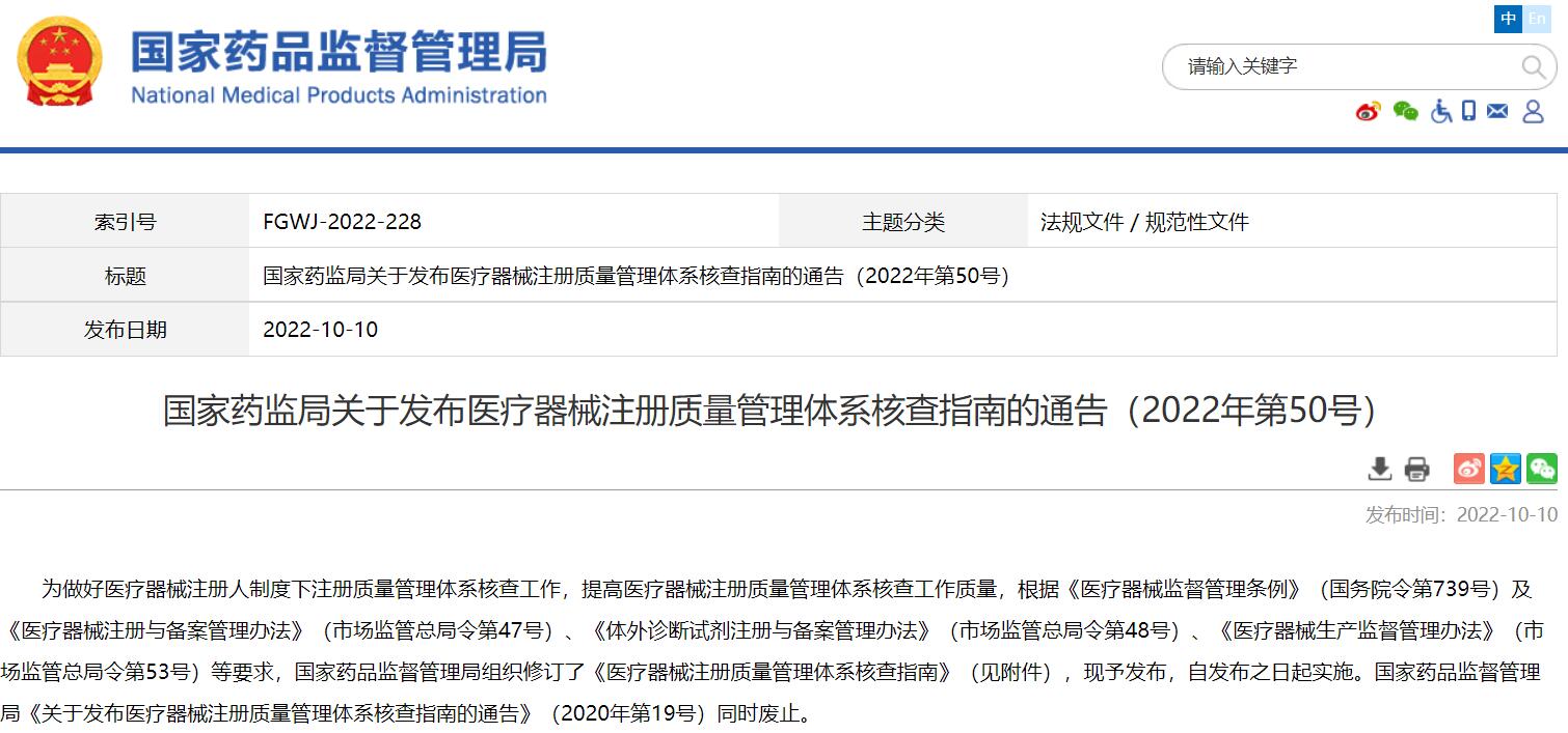 國家藥監(jiān)局關(guān)于發(fā)布醫(yī)療器械注冊質(zhì)量管理體系核查指南的通告(2022年第50號)