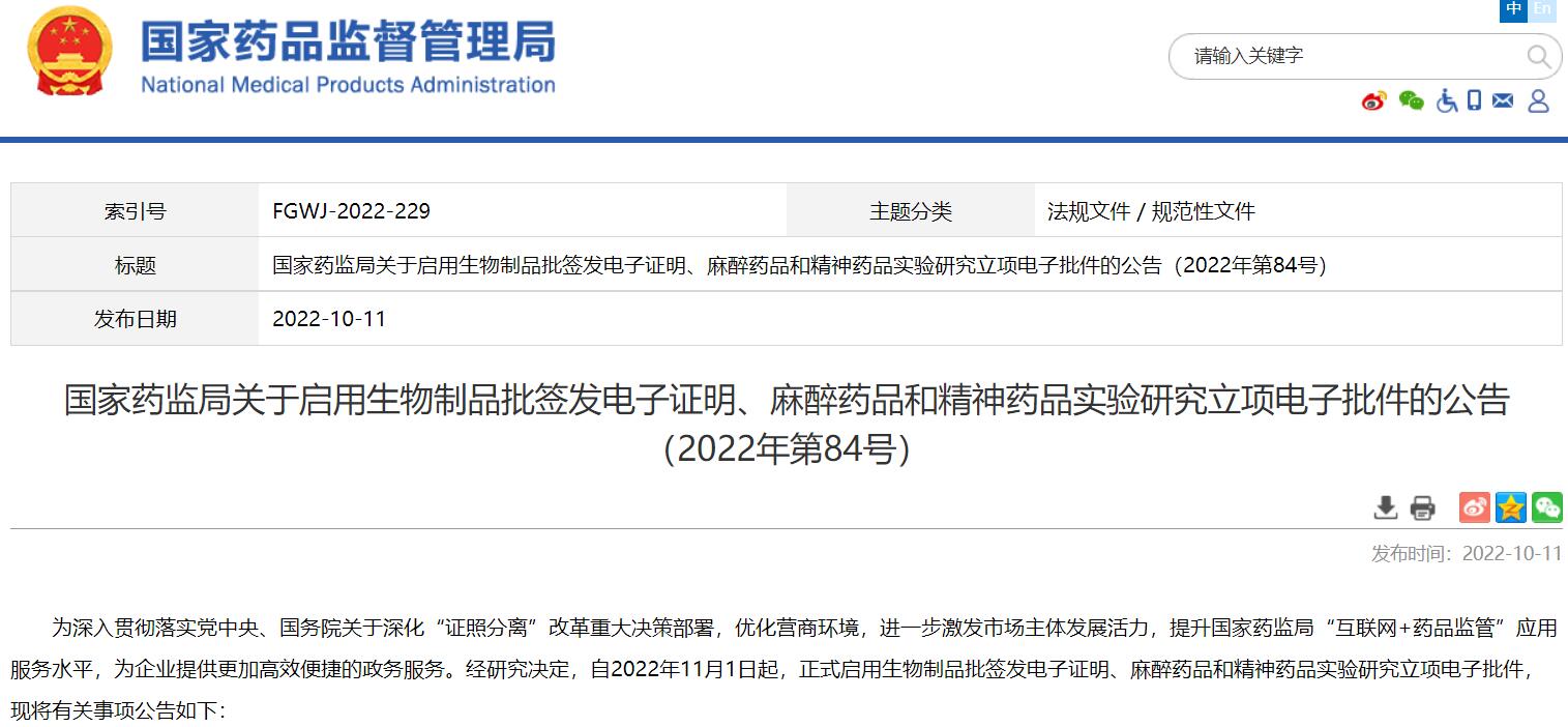 國家藥監(jiān)局關(guān)于啟用生物制品批簽發(fā)電子證明、麻醉藥品和精神藥品實(shí)驗(yàn)研究立項(xiàng)電子批件的公告(2022年第84號)