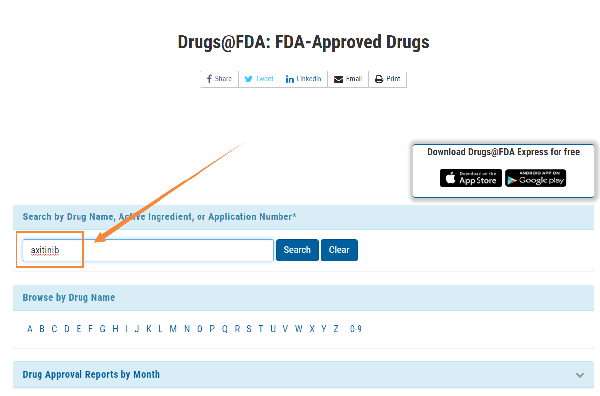 - 首先進入Drugs@FDA的搜索欄輸入阿昔替尼片的活性成分“axitinib”,然后點擊提