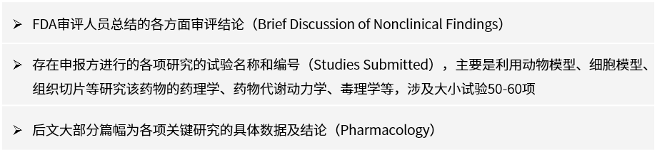該部分詳細記載了新藥臨床研究審批(IND)申請前藥物在動物體內進行的、能夠證明擬申報藥物在體內安全有效的詳細試驗數(shù)據(jù)及結論,包括藥理學研究、藥代動力學研究、安全藥理學研究、毒理學研究、藥效學研究等。該部分內容對仿制藥開發(fā)可參考意義不大,不過了解一下該藥物的作用機制及不良反應,或許可以更清楚參比制劑劑型、劑量、服用方式、處方工藝等設計的理由。