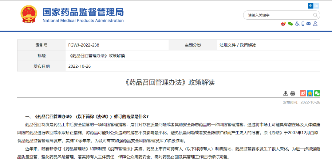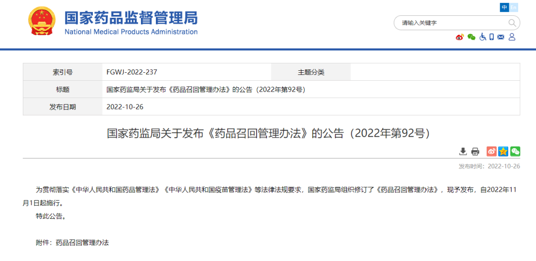 國家藥監(jiān)局關(guān)于發(fā)布《藥品召回管理辦法》的公告(2022年第92號(hào))