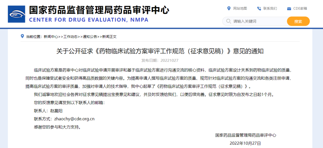 關(guān)于公開征求《藥物臨床試驗(yàn)方案審評(píng)工作規(guī)范(征求意見稿)》意見的通知