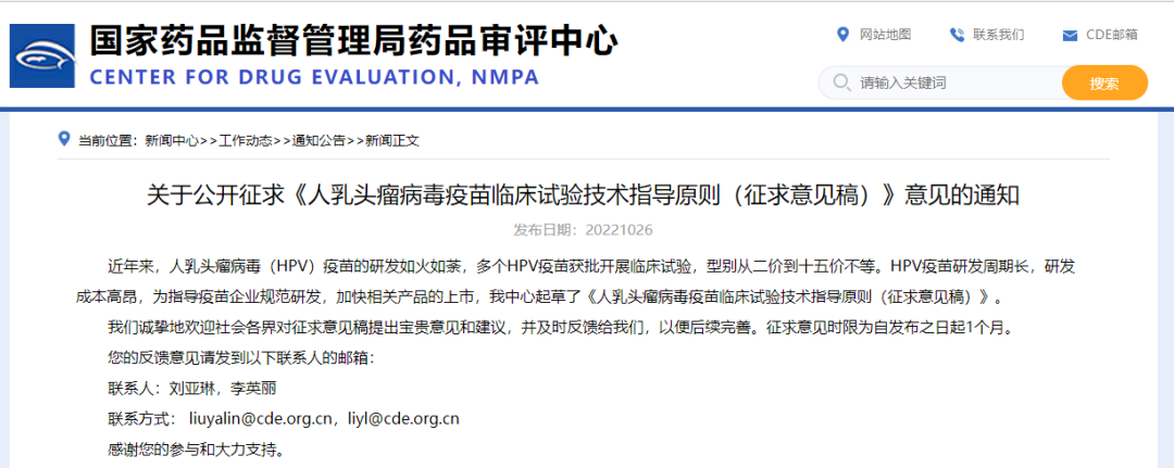 關(guān)于公開征求《人乳頭瘤病毒疫苗臨床試驗(yàn)技術(shù)指導(dǎo)原則(征求意見稿)》意見的通知