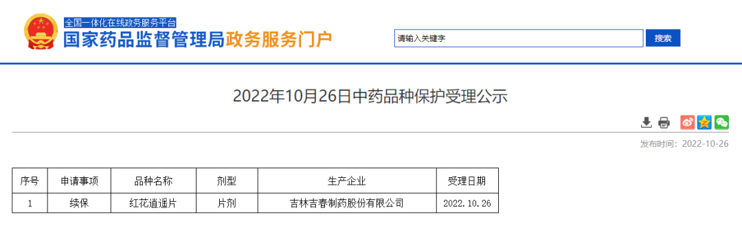 2022年10月26日中藥品種保護(hù)受理公示