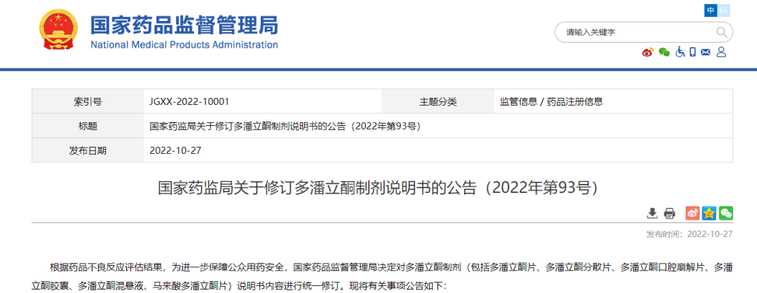 國家藥監(jiān)局關(guān)于修訂多潘立酮制劑說明書的公告(2022年第93號(hào))