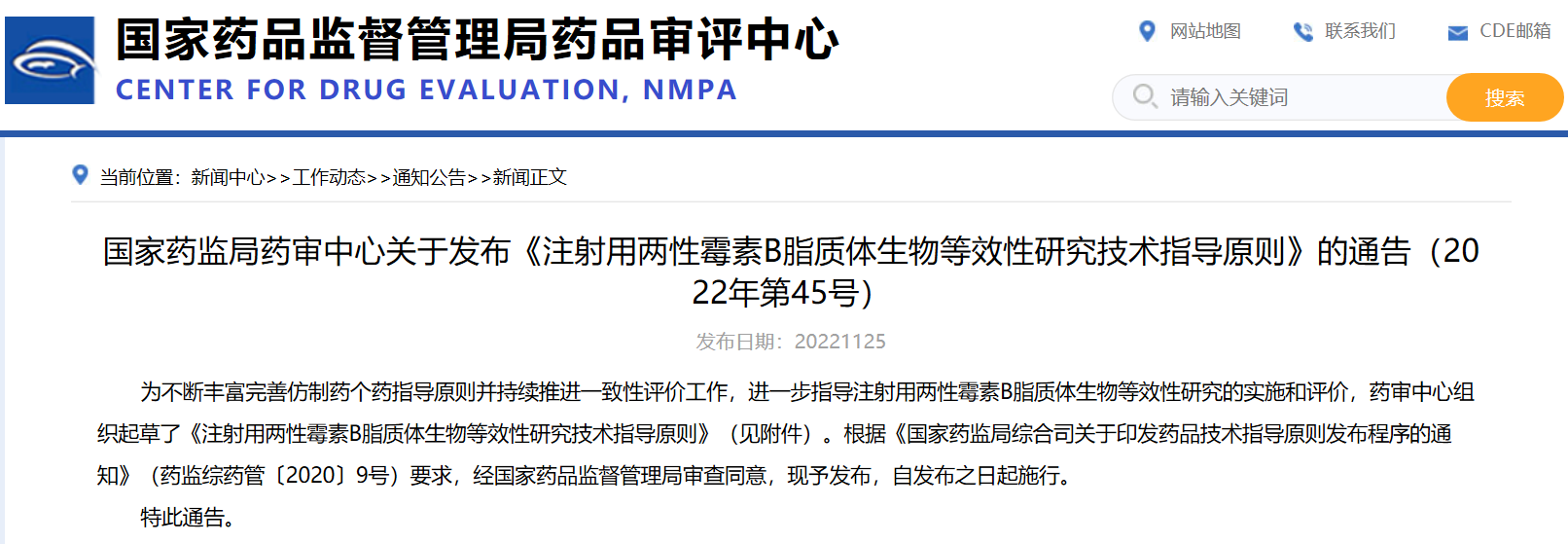 國(guó)家藥監(jiān)局藥審中心關(guān)于發(fā)布《注射用兩性霉素B脂質(zhì)體生物等效性研究技術(shù)指導(dǎo)原則》的通告(2022年第45號(hào))