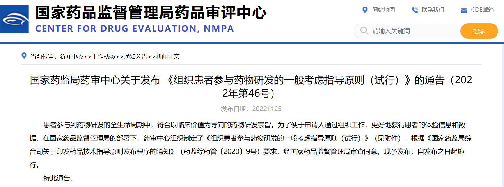 國(guó)家藥監(jiān)局藥審中心關(guān)于發(fā)布 《組織患者參與藥物研發(fā)的一般考慮指導(dǎo)原則(試行)》的通告(2022年第46號(hào))