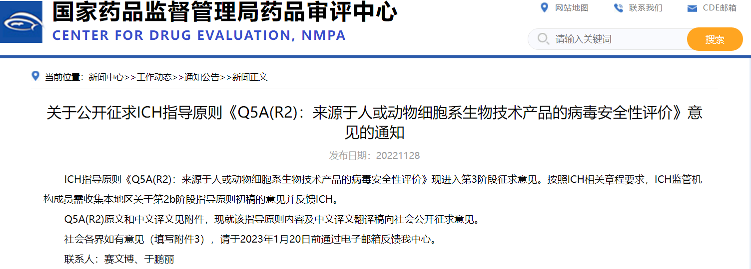 關(guān)于公開征求ICH指導(dǎo)原則《Q5A(R2):來源于人或動(dòng)物細(xì)胞系生物技術(shù)產(chǎn)品的病毒安全性評(píng)價(jià)》意見的通知