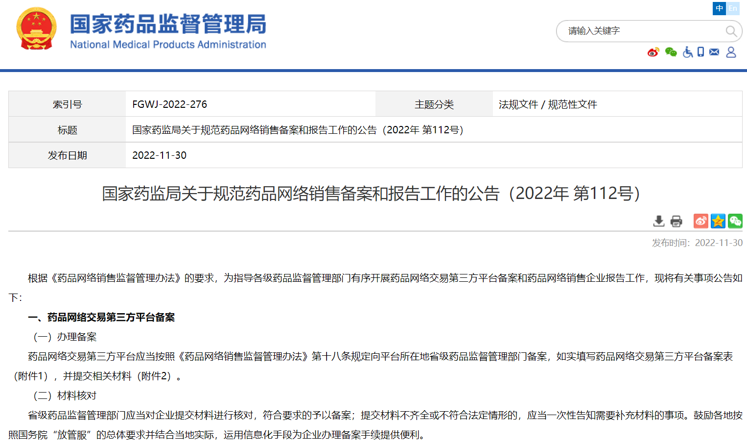 國(guó)家藥監(jiān)局關(guān)于規(guī)范藥品網(wǎng)絡(luò)銷售備案和報(bào)告工作的公告(2022年 第112號(hào))