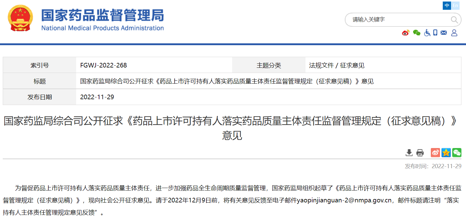 國(guó)家藥監(jiān)局綜合司公開征求《藥品上市許可持有人落實(shí)藥品質(zhì)量主體責(zé)任監(jiān)督管理規(guī)定》意見