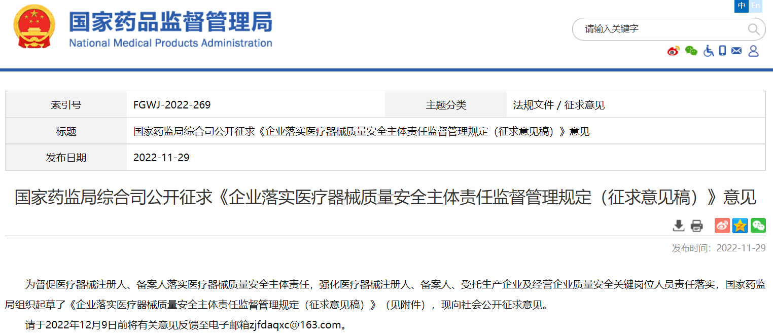 國(guó)家藥監(jiān)局綜合司公開征求《企業(yè)落實(shí)醫(yī)療器械質(zhì)量安全主體責(zé)任監(jiān)督管理規(guī)定(征求意見稿)》意見