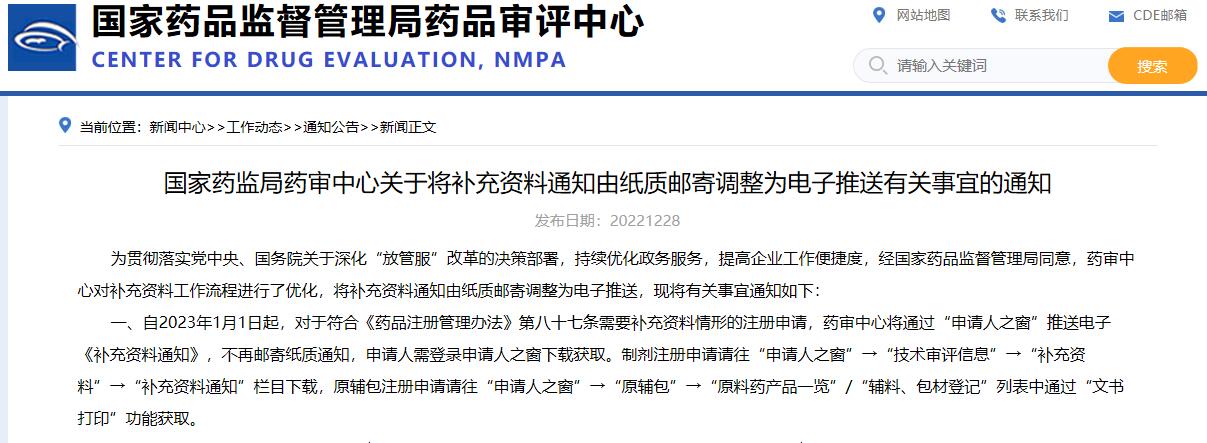 國家藥監(jiān)局藥審中心關(guān)于將補(bǔ)充資料通知由紙質(zhì)郵寄調(diào)整為電子推送有關(guān)事宜的通知