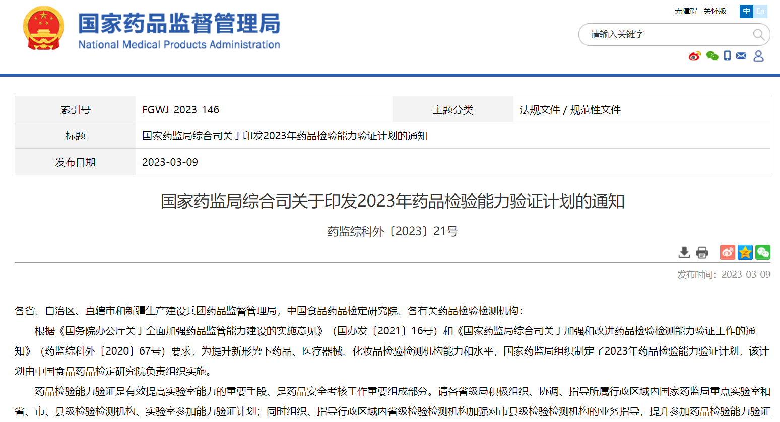 國家藥監(jiān)局綜合司關(guān)于印發(fā)2023年藥品檢驗?zāi)芰︱炞C計劃的通知