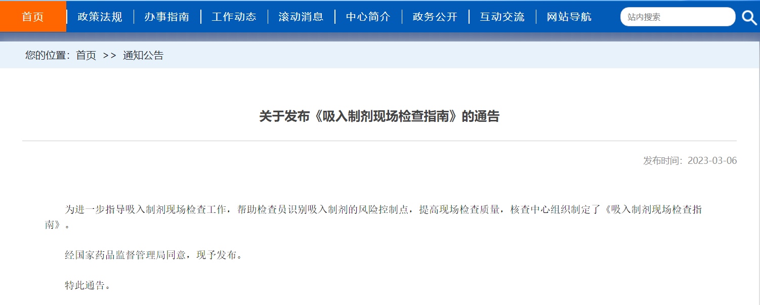 國家藥監(jiān)局核查中心關(guān)于發(fā)布《吸入制劑現(xiàn)場檢查指南》的通告