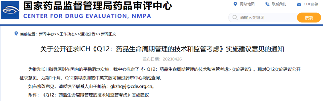 關于公開征求ICH《Q12:藥品生命周期管理的技術和監(jiān)管考慮》實施建議意見的通知