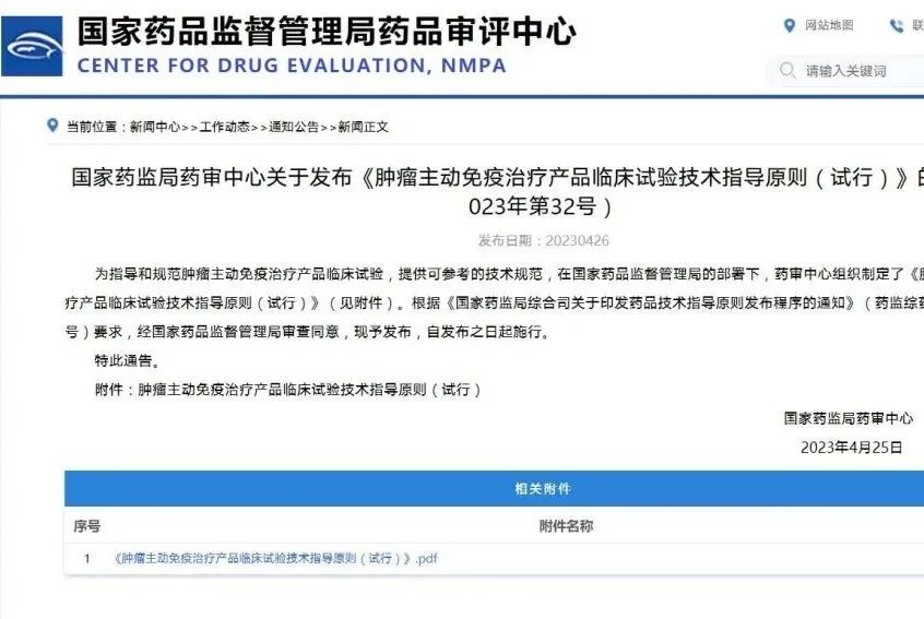 國家藥監(jiān)局藥審中心關于發(fā)布《腫瘤主動免疫治療產品臨床試驗技術指導原則(試行)》的通告(2023年第32號)