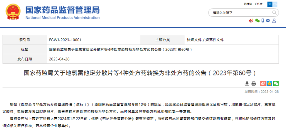 國家藥監(jiān)局關于地氯雷他定分散片等4種處方藥轉換為非處方藥的公告(2023年第60號)