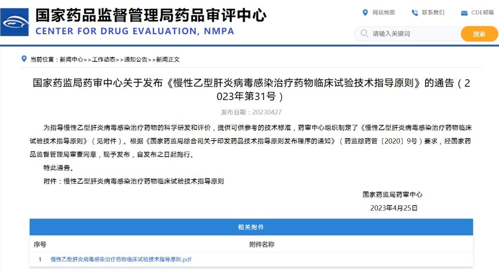 國家藥監(jiān)局藥審中心關于發(fā)布《慢性乙型肝炎病毒感染治療藥物臨床試驗技術指導原則》的通告(2023年第31號)