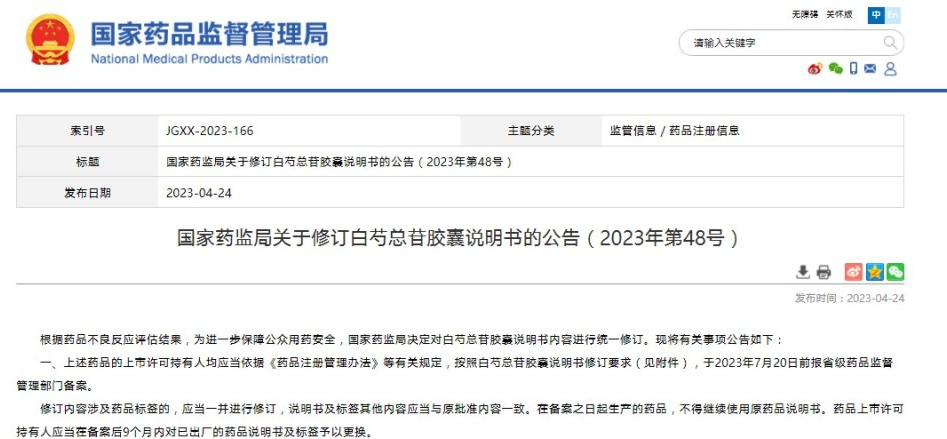 國家藥監(jiān)局關于修訂白芍總苷膠囊說明書的公告(2023年第48號)