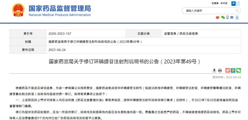 國家藥監(jiān)局關于修訂環(huán)磷腺苷注射劑說明書的公告(2023年第49號)