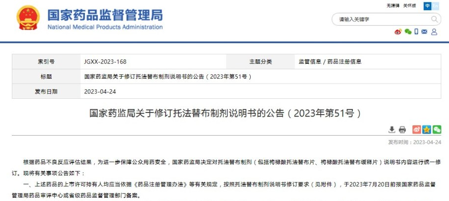國家藥監(jiān)局關于修訂托法替布制劑說明書的公告(2023年第51號)