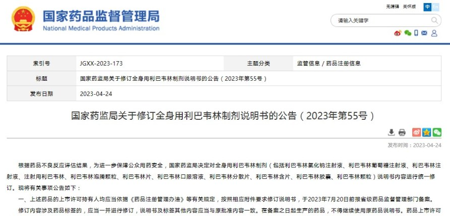 國家藥監(jiān)局關于修訂全身用利巴韋林制劑說明書的公告(2023年第55號)