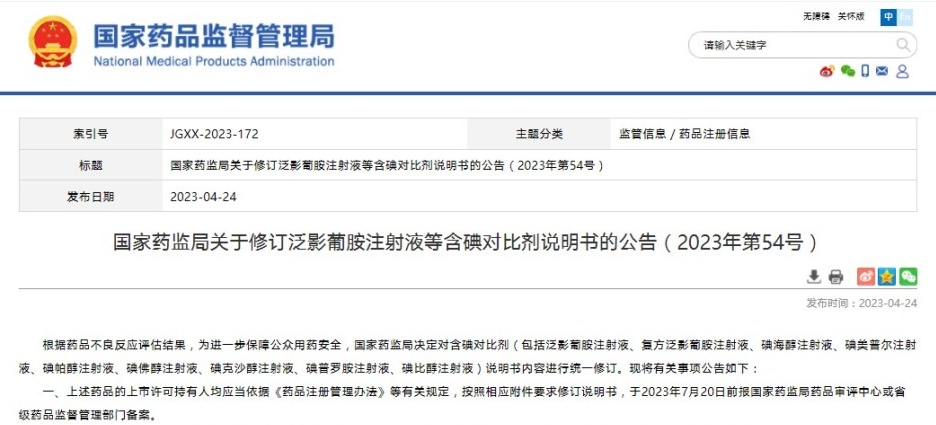 國家藥監(jiān)局關于修訂泛影葡胺注射液等含碘對比劑說明書的公告(2023年第54號)