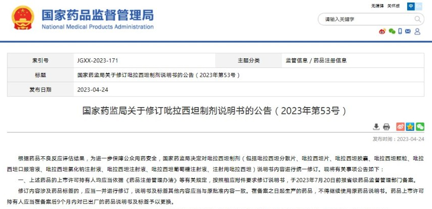 國家藥監(jiān)局關于修訂吡拉西坦制劑說明書的公告(2023年第53號)