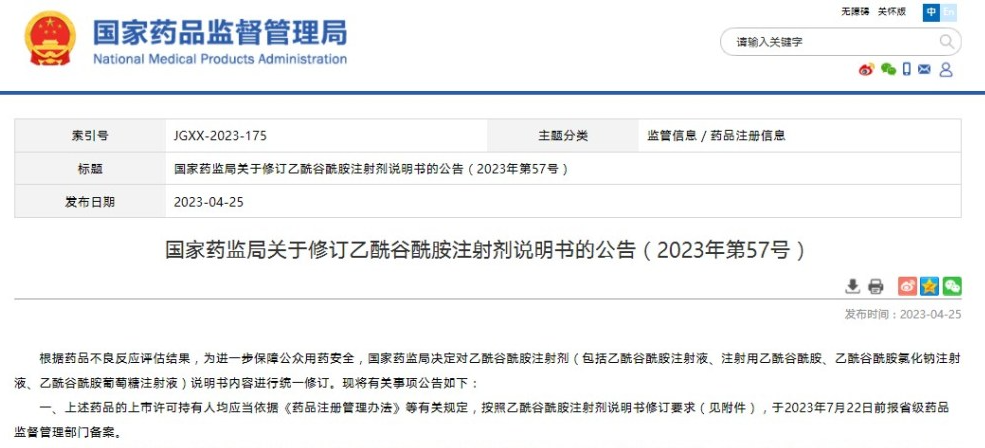 國家藥監(jiān)局關于修訂乙酰谷酰胺注射劑說明書的公告(2023年第57號)