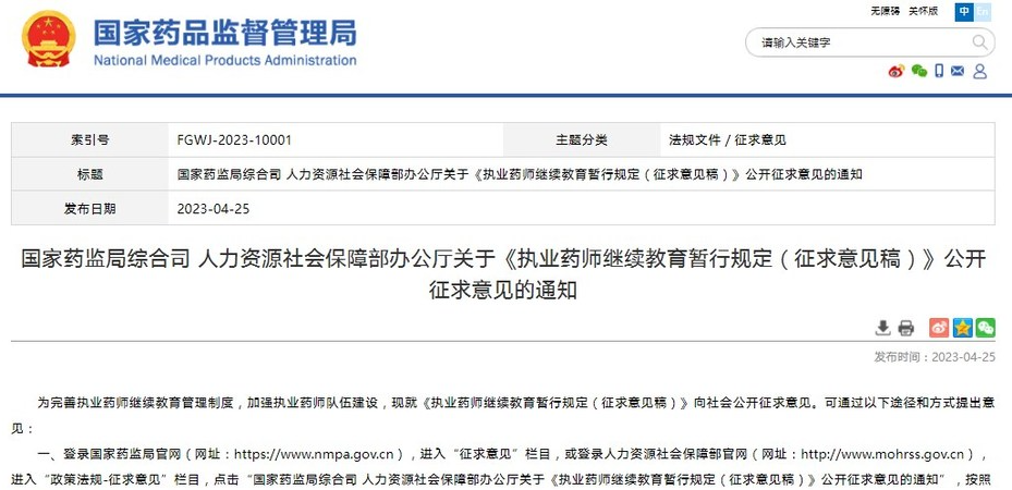 國家藥監(jiān)局綜合司 人力資源社會保障部辦公廳關于《執(zhí)業(yè)藥師繼續(xù)教育暫行規(guī)定(征求意見稿)》公開征求意見的通知