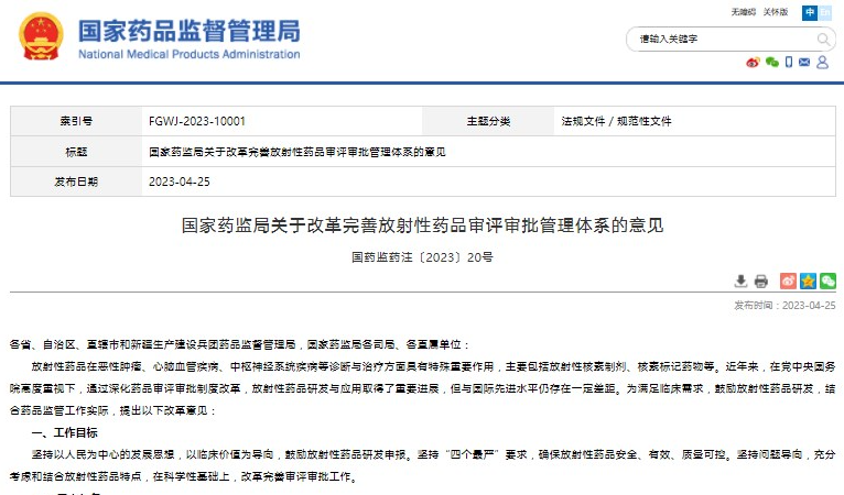國家藥監(jiān)局關于改革完善放射性藥品審評審批管理體系的意見
