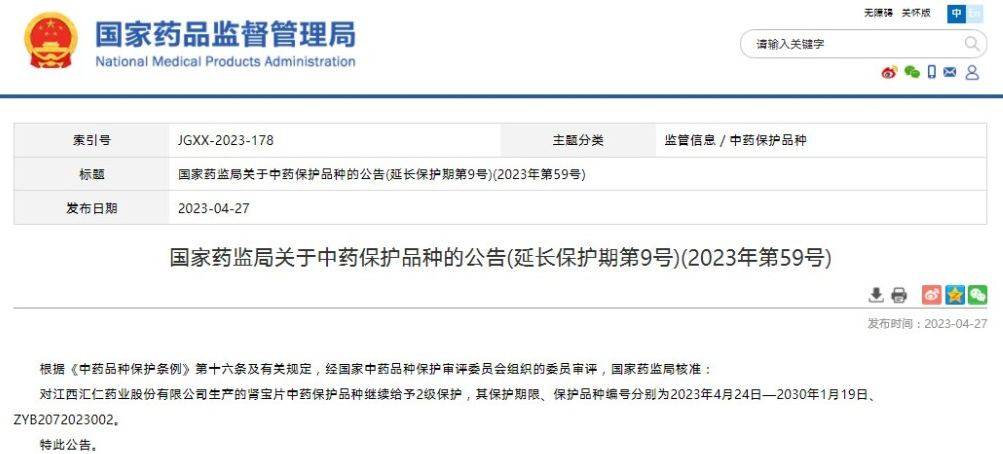 國家藥監(jiān)局關于中藥保護品種的公告(延長保護期第9號)(2023年第59號)