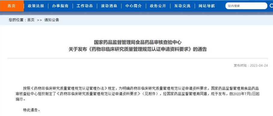 國家藥品監(jiān)督管理局食品藥品審核查驗中心關于發(fā)布《藥物非臨床研究質量管理規(guī)范認證申請資料要求》的通告